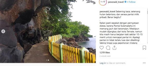 "Sebening kaca, setenang hutan belantara, dan serasa pantai milik pribadi. Benar begitu? Kalian pasti sepakat dengan pernyataan di atas, karena Pantai Sulamadaha ini memang jauh dari keramaian. Meskipun mudah dijangkau dari kota Ternate, namun kita masih harus berjalan kaki sekitar 10-15 menit untuk mencapai pantai ini. Apalagi pantai ini tidak terlalu luas dan dikelilingi tebing tinggi juga pepohonan rindang sehingga memberi kesan private. Hamparan pasir putih dan beningnya air laut yang bergradasi hijau kebiru-biruan siap menyambut kita di Pantai Sulamadaha. Air lautnya yang jernih seolah memanggil dan mengajak kita bermain, bahkan bisa jadi membuat kita betah berlama-lama di dalam air. Kalau tak mau basah-basahan, kita tetap bisa menikmati kejernihan air laut dengan berperahu. Asyik khan! Sehabis bermain di pantai, paling enak berwisata kuliner. Nah, mau tahu kuliner khas daerah Ternate?," tulis Instagram @Pesonaid_Travel dikutip Selasa (11/12/2018).