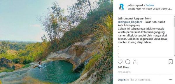 "Salah satu sudut Kota Tulungagung. Coban ini sebenarnya tidak termasuk wisata pemerintah Kota Tulungangung, namun dikelola sendiri oleh masyarakat sekitar. Coban ini digunakan untuk ritual manten Kucing stiap tahun," tulis Instagram @jatim.repost, dikutip Kamis (10/1/2019).