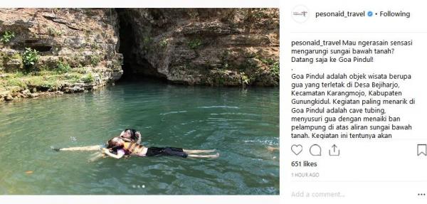 "Mau ngerasain sensasi mengarungi sungai bawah tanah? Datang saja ke Goa Pindul! Goa Pindul adalah objek wisata berupa gua yang terletak di Desa Bejiharjo, Kecamatan Karangmojo, Kabupaten Gunungkidul. Kegiatan paling menarik di Goa Pindul adalah cave tubing, menyusuri gua dengan menaiki ban pelampung di atas aliran sungai bawah tanah. Kegiatan ini tentunya akan menjadikan petualangan wisatamu semakin tak terlupakan. Sensasinya mengasyikkan sekaligus menegangkan," tulis Instagram @Pesonaid_travel, dikutip Sabtu (26/1/2019).
