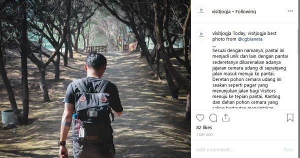 "Sesuai dengan namanya, pantai ini menjadi unik dan lain dengan pantai sederetannya, dikarenakan adanya jajaran cemara udang di sepanjang jalan masuk menuju ke pantai. Deretan pohon cemara udang ini seakan seperti pagar yang menunjukkan jalan bagi Visitors menuju ke tepian pantai. Ranting dan dahan pohon cemara yang saling bertautan menciptakan semacam lorong yang berujung pada pemandangan laut selatan yang romantis, Loh!," tulis Instagram @visitjogja, dikutip Senin (9/9/2019).