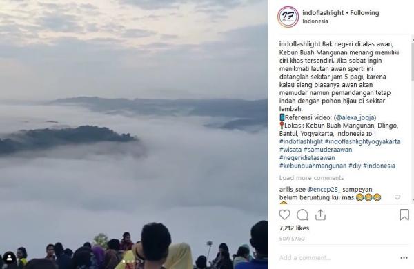 "Bak negeri di atas awan, Kebun Buah Mangunan memang memiliki ciri khas tersendiri. Jika sobat ingin menikmati lautan awan seperti ini, datanglah sekitar jam 5 pagi, karena kalau siang biasanya awan akan memudar namun pemandangan tetap indah dengan pohon hijau di sekitar lembah," tulis Instagram Indoflashlight, dikutip Kamis (31/1/2019).