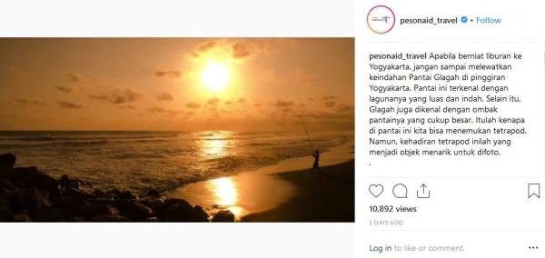 "Apabila berniat liburan ke Yogyakarta, jangan sampai melewatkan keindahan Pantai Glagah di pinggiran Yogyakarta. Pantai ini terkenal dengan lagunanya yang luas dan indah. Selain itu, Glagah juga dikenal dengan ombak pantai yang cukup besar. Itulah kenapa di pantai ini kita bisa menemukan tetrapod. Namun, kehadiran tetrapod inilah yang menjadi objek menarik untuk difoto. Jika ingin merasakan sensasi yang berbeda di Pantai Glagah, kita juga bisa mencoba menyusuri Pantai Glagah dengan naik ATV atau Motorcross," tulis Instagram @Pesonaid_Travel dikutip Rabu (21/11/2018).