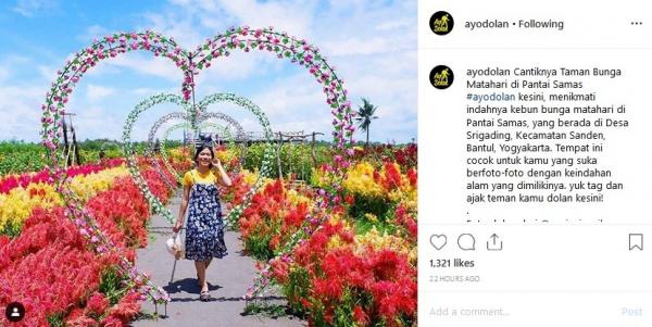 "Cantiknya Taman Bunga Matahari di Pantai Samas. Ayo dolan ke sini. Menikmati indahnya kebun bunga matahari di Pantai Samas yang berada di Desa Srigading, Kecamatan Sanden, Kabupaten Bantul, Yogyakarta. Tempat ini cocok untuk kamu yang suka berfoto-foto dengan keindahan alam yang dimilikinya. Yuk, tag dan ajak teman kamu dolan ke sini!" tulis Instagram @ayodolan, dikutip Minggu (5/5/2019).