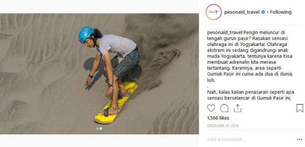 "Ingin meluncur di tengah gurun pasir? Rasakan sensasi olahraga ini di Yogyakarta! Olahraga ekstrem ini sedang digandrungi anak muda Yogyakarta, tentunya karena bisa membuat adrenalin kita merasa tertantang. Kerennya, area seperti Gumuk Pasir ini cuma ada dua di dunia, loh," tulis Instagram @Pesonaid_Travel, dikutip Rabu (23/1/2019).