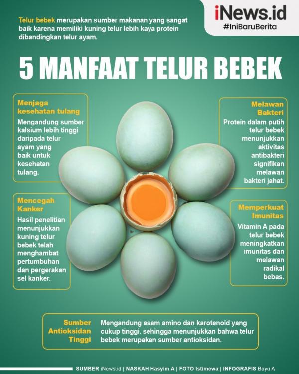 JAKARTA, iNews.id - Telur bebek merupakan sumber makanan yang sangat baik karena memiliki kuning telur lebih kaya protein dibandingkan telur ayam. Selain mengandung protein, lemak, dan antioksidan, telur bebek juga mengandung multivitamin dan mineral.
