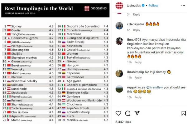 Daftar top 100 Dumpling in The World dirilis pada Senin, 8 April 2024. Siomay berhasil mengalahkan Guotie dari China atau yang dikenal sebagai Kuotie di Indonesia.