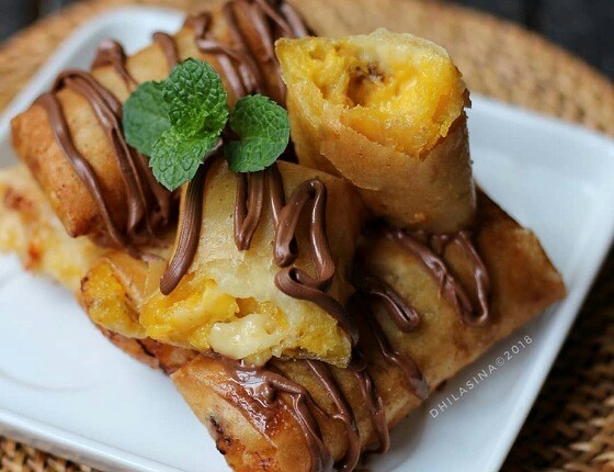 10. Isi dadar dengan potongan pisang dan ditambah selai coklat. Lalu gulung. Dadar gulung pisang coklat, siap disantap.