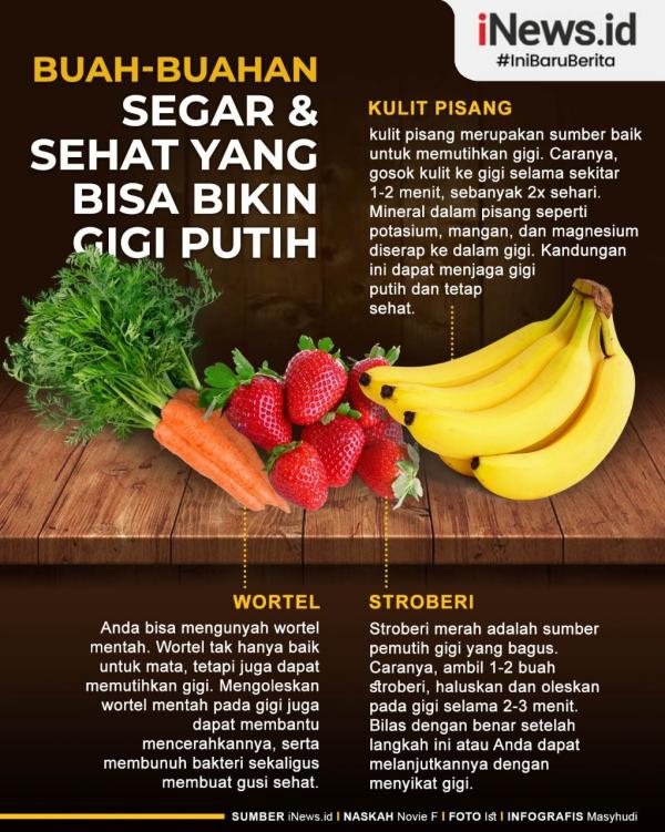 Pisang dianggap sebagai salah satu buah sehat yang mengandung banyak nutrisi. Tapi tahukah Anda, kulit pisang juga merupakan sumber baik untuk memutihkan gigi. Caranya, gosok kulit ke gigi Anda selama sekitar satu atau dua menit, sebanyak dua kali sehari. Mineral dalam pisang seperti potasium, mangan, dan magnesium diserap ke dalam gigi. Kandungan ini dapat menjaga gigi putih dan tetap sehat.