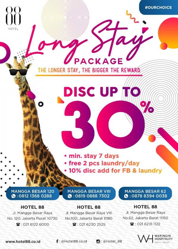 Bahkan, mereka juga memberikan promo menarik bagi pengunjung seperti Long Stay Package bagi Anda yang menginap selama tujuh hari. Anda akan mendapatkan diskon up to 30 persen, sudah termasuk gratis dua item laundry per hari, serta diskon 10 persen untuk F&B dan laundry.