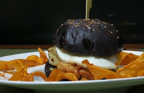 Salah satu gambaran masakan fusion Eropa-Asia yang disajikan Chef Noldy adalah burger hitam dibuat dengan tinta cumi dan diisi dengan potongan chicken fillet, telur setengah matang, sayur-sayuran, dan bumbu istimewa dari Asia. Yaitu saus dari Jepang atau teriyaki yang dipadu dengan saus barbeque.