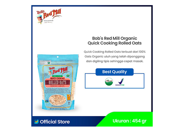 Bob'as Red Mill Organic Quick Cooking Rolled Oats terbuat dari 100% gandum utuh organik yang digiling lebih tipis dibandingkan oat reguler sehingga lebih cepat matang saat dimasak.