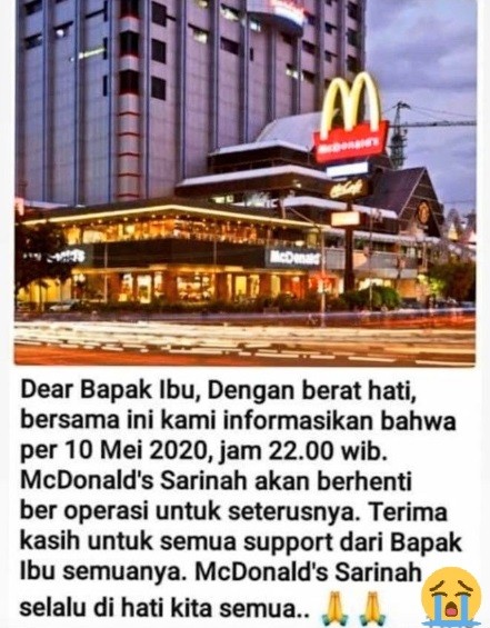 “Dear Bapak Ibu, Dengan berat hati, bersama ini kami informasikan bahwa per 10 Mei 2020, jam 22.00 wib. McDonald’s Sarinah akan berhenti ber operasi untuk seterusnya. Terima kasih untuk semua support dari Bapak Ibu semuanya. McDonald’s Sarinah selalu di hati kita semua,” tulis akun @jobilang, dikutip iNews.id pada Kamis (7/5/2020).
