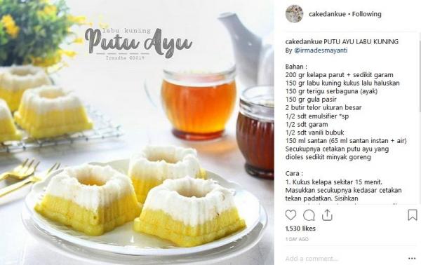Perpaduan roti putu dengan kelapa sangat pas dan lezat. Cocok dimakan kapan saja, apalagi dimakan sambil menyeruput teh hangat. Jika Anda tertarik ingin membuat kue putu ayu, tidak ada salahnya berkreasi dengan labu kuning. Tak hanya lezat, kue putunya juga sehat.