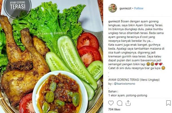"Bosen dengan ayam goreng lengkuas, saya bikin Ayam Goreng Terasi. Ini bikinnya diungkep dulu, pakai bumbu ungkep terus ditambah terasi. Beda sama ayam goreng terasinya d'cost yang resepnya banyak beredar itu ya. Kata suami juga enak banget, gurihnya beda. Apalagi saya tambahkan maizena di sisa kuah ungkepnya, digoreng jadi kremesan gurih rasa terasi. Saya kalau dapat pujian dari suami bawaannya jadi semangat pengen bikin lagi. Catet di sini dulu resepnya biar ga lupa," tulis Instagram @tsaniwismono, Jumat (26/10/2018).