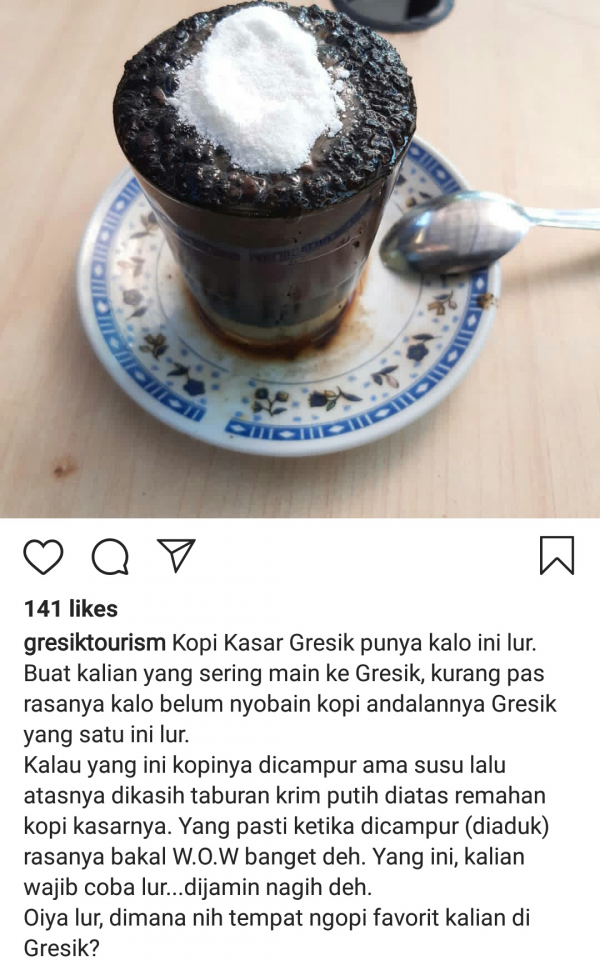 "Kopi Kasar Gresik punya kalo ini, lur. Kalau yang ini, kopinya dicampur sama susu lalu atasnya dikasih taburan krim putih di atas remahan kopi kasarnya. Ketika dicampur (diaduk), rasanya bakal wow banget. Kalian wajib coba. Dijamin nagih. Di mana nih tempat ngopi favorit kalian di Gresik? Foto: @indrokusworo," tulis Instagram @gresiktourism, dikutip Rabu (31/7/2019).