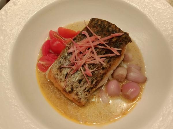 Jika tadi ada sajian yang menggunakan gurita, pada sajian kali ini yakni memakai barramundi atau ikan kakap. Sesuai namanya, menu satu ini menggunakan bumbu gulai yang disajikan dengan kecombrang.