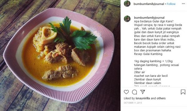 "Apa bedanya Gulai dgn Kare? Wujud serupa, tapi rasa dan wangi beda yah. Yah, untuk Gulai pakai rempah gulai dan daun kunyit jd wanginya khas dan untuk Kare pakai rempah kare dan daun kare khas India. Besok besok buka order untuk makanan Aqiqah selain catring nasi box dan prasmanan, hahaha. Resep Gulai Kambing," tulis Instagram @bumbumfamilyjournal dikutip Jumat (6/3/2020).