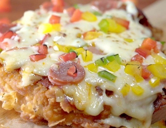 5. Tempatkan ayam yang sudah digoreng pada wadah tahan panas. Beri bagian atasnya saus bolognese, keju mozarela, sosis dan paprika.