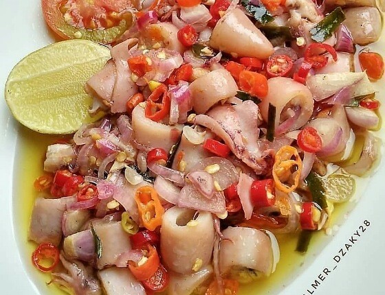 2. Rebus cumi selama 3 menit. Angkat tiriskan. Potong kecil dan tata di piring.