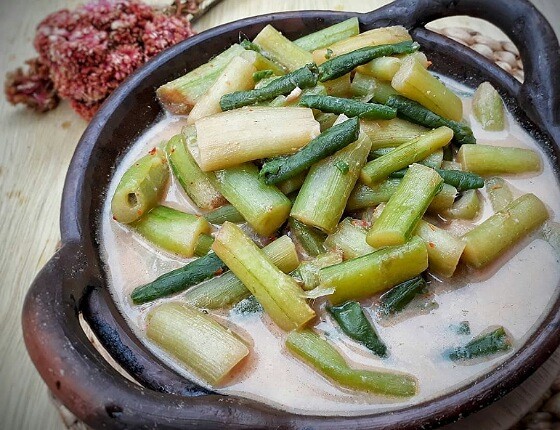 10 batang lompong/batang talas, kupas kulit arinya hingga bersih, potong- potong lalu cuci hingga bersih, didihkan air masukkan lompong, rebus sebentar agar getahnya hilang, angkat dan sisihkan