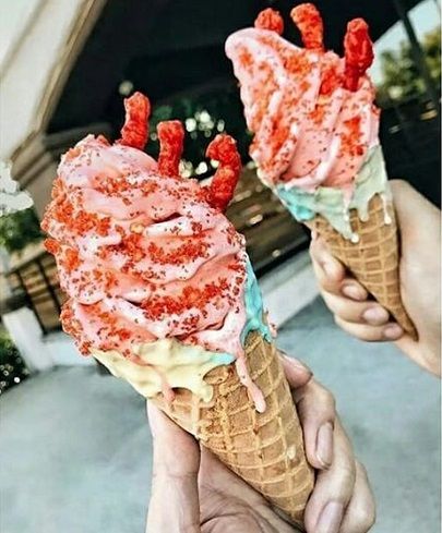 Apa jadinya kalau makanan ringan bercitarasa pedas dijadikan bahan baku untuk perasa es krim. Cuma ada di Amerika Serikat, tetapi kamu bisa nih mencoba membuat sendiri di rumah. Kalau kata mereka sih rasanya campuran api dan es, pedas dan manis. Menarik!