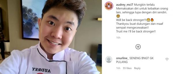 Dikritik juri dan terancam pulang, Audrey meminta maaf melalui akun Instagramnya. Dengan selfie sambil tersenyum, Audrey meyakinkan diri bisa tampil lebih baik lagi hari ini.