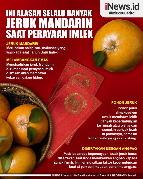 Salah satu hidangan yang sangat khas dari Imlek adalah jeruk Mandarin. Jeruk berwarna kuning cerah dengan rasa agak asam tersebut sepertinya tak pernah absen di perayaan Imlek. Tahukah Anda kenapa selalu banyak jeruk Mandarin di Tahun Baru Imlek?